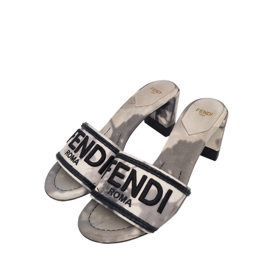 Fendi Signature Floral Motif Slide Sandals White Black Canvas Size 36/24